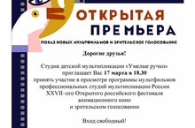Студия детской мультипликации "Умелые ручки" приглашает всех принять участие в просмотре программы мультфильмов профессиональных студий мультипликации России XXVII Открытого российского фестиваля анимационного кино и зрительском голосовании. Вход свободный. Принимаются заявки от классных коллективов и групп д/с. Мероприятие пройдет в актовом зале "ЦВР" Московского района 17 марта в 18.30 по адресу ул. Восстания, 61а.