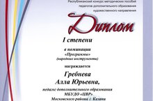 Поздравляем Гребневу Аллу Юрьевну с дипломом 1 степени республиканского конкурса методических пособий педагогов дополнительного образования художественной направленности в номинации "Программы" (народные инструменты)!