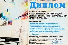 Муниципальное бюджетное учреждение дополнительного образования "Центр внешкольной работы" Московского района г. Казани награжден Дипломом Всероссийского конкурса "100 лучших организаций дополнительного образования детей России". Поздравляем коллектив ЦВР и директора Рамзию Мунавировну с присвоением почетного знака "Директор года-2018"!