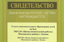 В 2017 году мы приняли участие в национальной программе продвижения лучших товаров и услуг среди детей и подростков. Конкурс на присвоение Знака качества «Лучшее – детям» проводился Объединенной экспертной комиссией, сформированной на базе ФБУ «РОСТЕСТ-Москва» и Института региональных экономических исследований. Наша услуга «Дополнительное образование детей» на базе МБУДО «Центр внешкольной работы» в результате получила положительную оценку экспертной комиссии и награждена Знаком качества «Лучшее-детям». Присвоение данного знака дает официальное право на маркировку заявленной услуги сроком на 2 года Знаком качества «Лучшее-детям».Мы по праву гордимся, что предоставляемые нами услуги достойны знаков такого уровня!