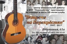 Дорогие друзья! Нашему клубу "Перекресток" исполнилось 20 лет! Мы хотим отметить это событие праздничным концертом и приглашаем всех друзей на праздник! Приходите семьями, вместе с детьми, будет интересно всем! Вход свободный!