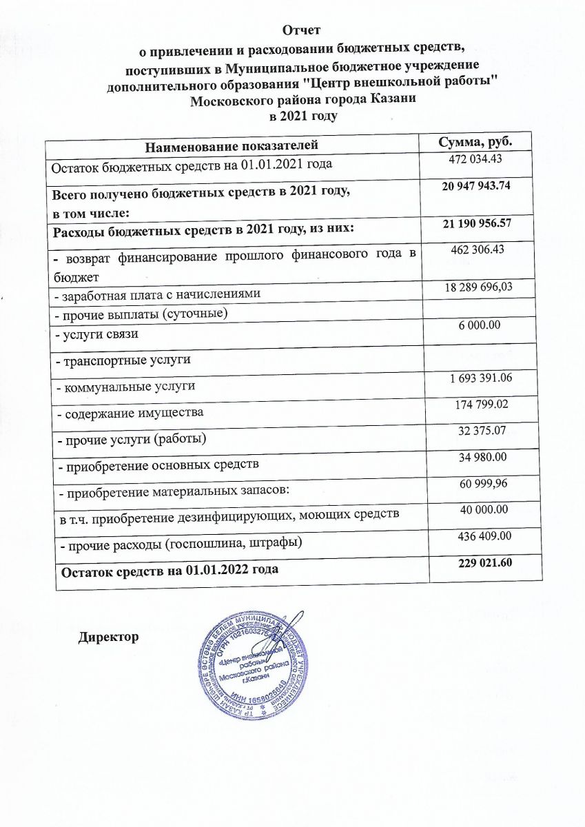Отчет о привлечении и расходовании бюджетных средств, поступивших в ЦВР в 2021 году