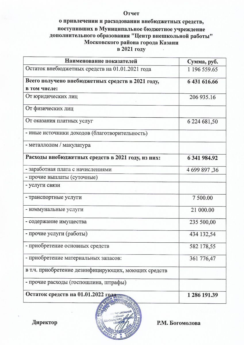 Отчет о привлечении и расходовании внебюджетных средств, поступивших в ЦВР в 2021 году