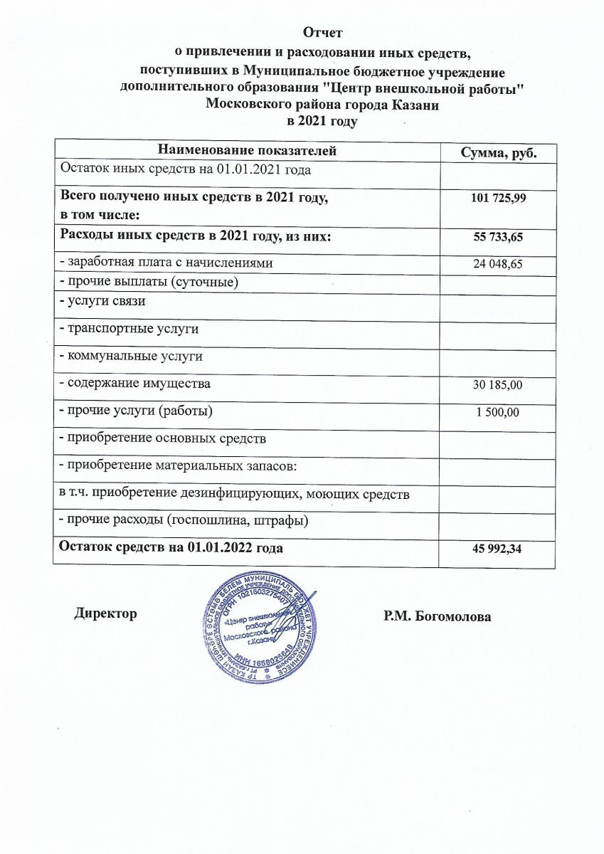 Отчет о привлечении и расходовании иных средств, поступивших в ЦВР в 2021 году