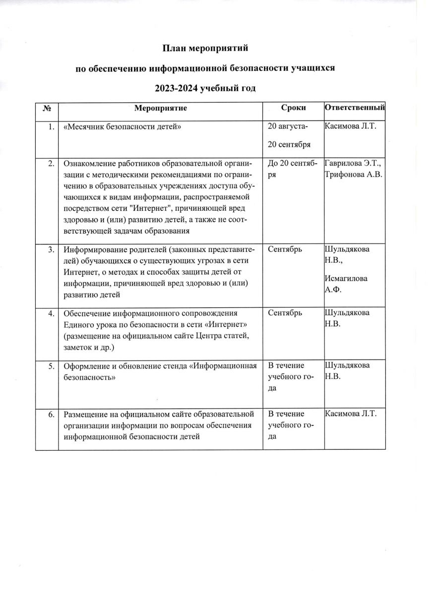 План мероприятий по обеспечению информационной безопасности 2023-2024 учебный год