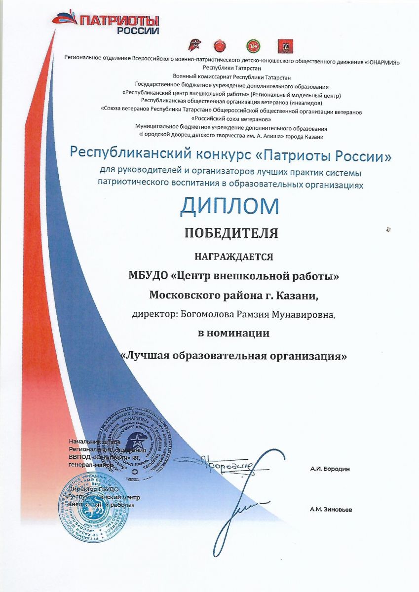 Диплом победителя Республиканского конкурса "Патриоты России"
