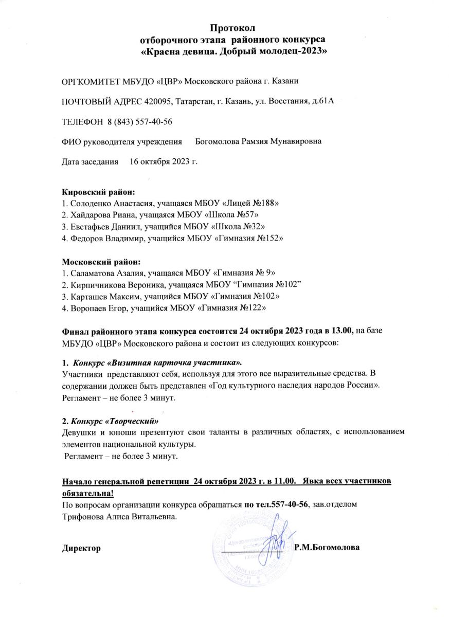 Протокол районного конкурса "Красна девица. Добрый молодец - 2023"