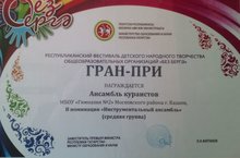 В финале Республиканского конкурса-фестиваля детского народного творчества среди общеобразовательных организации "Без безргэ" ансамбль кураистов ТДМШ № 32 "Тылсымлы курай" (рук. Хисамов А.А., конц. Гарифуллин И.В.) в номинации "Инструментальный ансамбль" средняя группа завоевали ГРАН-ПРИ!!!