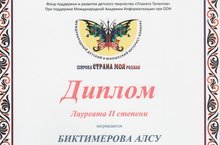 Поздравляем Биктимерову А.И. со званием Лауреата 2 степени международного детского и юношеского интернет-конкурса фонда "Планета талантов" "Широка страна моя родная".