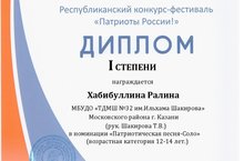 В Республиканском конкурсе-фестивале «Патриоты России!» приняла участие ученица Хабибуллина Ралина (преп. Шакирова Татьяна Викторовна) и стала Лауреатом 1 степени.