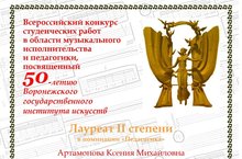 Преподаватель Артамонова Ксения Михайловна приняла участие и стала Лауреатом 2 степени во Всероссийском конкурсе студенческих работ в области музыкального исполнительства и педагогики, посвященный 50-летию Воронежского государственного института искусств в номинации «Педагогика».