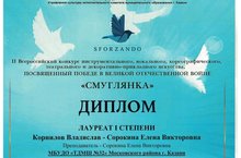 3 мая 2020 года состоялся II Всероссийский конкурс инструментального, вокального, хореографического, театрального и декоративно-прикладного искусства, посвященный победе в великой отечественной войне «Смуглянка», в котором Дуэт учитель-ученик: Корнилов Владислав и Сорокина Елена Викторовна стал Лауреатом 1 степени!