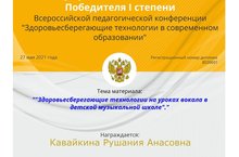 27 мая 2021 года состоялась Всероссийская педагогическая конференции «Здоровьесберегающие технологии в современном образовании», в которой преподаватель Кавайкина Рушания Анасовна приняла участие с публикацией «Здоровьесберегающие технологии на уроках вокала в детской музыкальной школе» и стала Победителем 1 степени.
