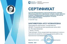 Преподаватель Биктимерова Алсу Исмаиловна приняла участие в Международном научно-методическом семинаре «Вокальное искусство и образование: история, теория, практика» в рамках IV Международного конкурса вокального мастерства имени Галии Кайбицкой, посвященного 115-летию со дня рождения певицы с докладом «Роль концертмейстера вокального класса в музыкальном развитии учащихся в процессе работы над музыкальным произведением».
