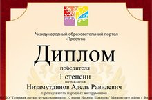 В апреле 2021 года состоялся Международный творческий конкурс «Престиж», в котором преподаватель нашей школы Низамутдинов Адель Равилевич стал победителем, занял 1 место, в номинации «Инновационная деятельность педагога» за работу «Инновационные технологии в обучении балалаечников и домристов: об игре под фонограмму».