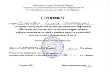 23 марта 2021 года в Набережных Челнах состоялась Республиканская научно-практическая конференция «Методические аспекты использования интерактивных и информационных технологий в учебном процессе учреждений дополнительного образования», в которой преподаватель нашей школы Салахова Регина Инсафовна приняла участие с публикацией и получила сертификат.