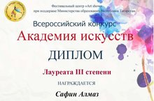 В феврале 2021 года прошел Всероссийский конкурс «Академия искусств», в котором ученик нашей школы Сафин Алмаз, преп. Арсланова Дания Наилевна, в номинации «Общее фортепиано» стал Лауреатом 3 степени!