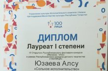 30 января прошел VI Открытый Республиканский фестиваль-конкурс «Жиганов — ViVo» в рамках Республиканского конкурса детского творчества «100//ЛИЦА», в котором учащаяся нашей школы Юзаева Алсу, преп. Ирбулатова Лилия Камилевна, стала Лауреатом 1 степени.