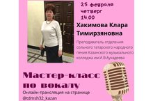 Приоткроет секреты вокала для вас преподаватель отделения сольного татарского народного пения Казанского музыкального колледжа им. И.В.Аухадеева Хакимова Клара Тимирзяновна. Она будет заниматься с учениками Татарской музыкальной школы №32 имени Ильхама Шакирова.