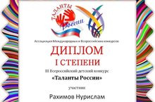 С 11 января по 12 февраля проводится III Всероссийский детский конкурс «Таланты России», в котором ученик нашей школы Рахимов Нурислам, преподаватель Низамутдинов А.Р., стал Дипломантом 1 степени!