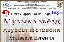 24 декабря 2020 года в г.Москва прошел Международный конкурс "Музыка звезд", на котором ученица нашей школы Матвеева Евгения, преподаватель Марданова Гульнара Ритальевна, стала лауреатом 3 степени.