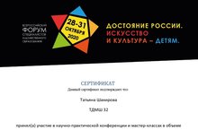 28-31 октября 2020 года в г.Москва прошел Всероссийский форум специалистов художественного образования "Достояние России. Искусство и культура - детям". В научно-практической конференции и мастер-классах форума приняла участие преподаватель нашей школы Шакирова Татьяна Викторовна.