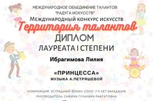 Поздравляем нашу юную звёздочку Ибрагимову Лилию, преподаватель Сафина Г.Р., ставшую Лауреатом 1 степени Международного конкурса искусств "Территория талантов". Упорный труд и воля к победе были достойно оценены членами жюри.