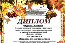 15 ноября 2020 года прошел II Международный конкурс-фестиваль профессионального мастерства педагогов и музыкальных руководителей "Осенние напевы". Преподаватель нашей школы Шарипова Илюза Байкаловна в этом конкурсе заняла призовые места в двух номинациях: Лауреат 1 степени в номинации "Методическая разработка. Программно-методическое сопровождение образовательного процесса" и Лауреатом 2 степени в номинации "Вокал. Преподаватель".