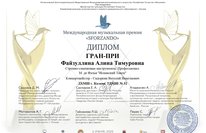 Преподаватель нашей школы Файзуллина Алина Тимуровна получила две награды: ГРАН-ПРИ в номинации «Струнно-смычковые инструменты. Профессионал» за исполнение М. де Фалья «Испанский танец», и Лауреата 1 степени в той же номинации за исполнение произведения П.И.Чайковского «Мелодия».