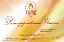 Заслужила Благодарственное письмо от Настоятеля прихода Отца Андрея (Старцев) за большой вклад в музыкально - эстетическое и профессиональное образование в воспитание подрастающего поколения.