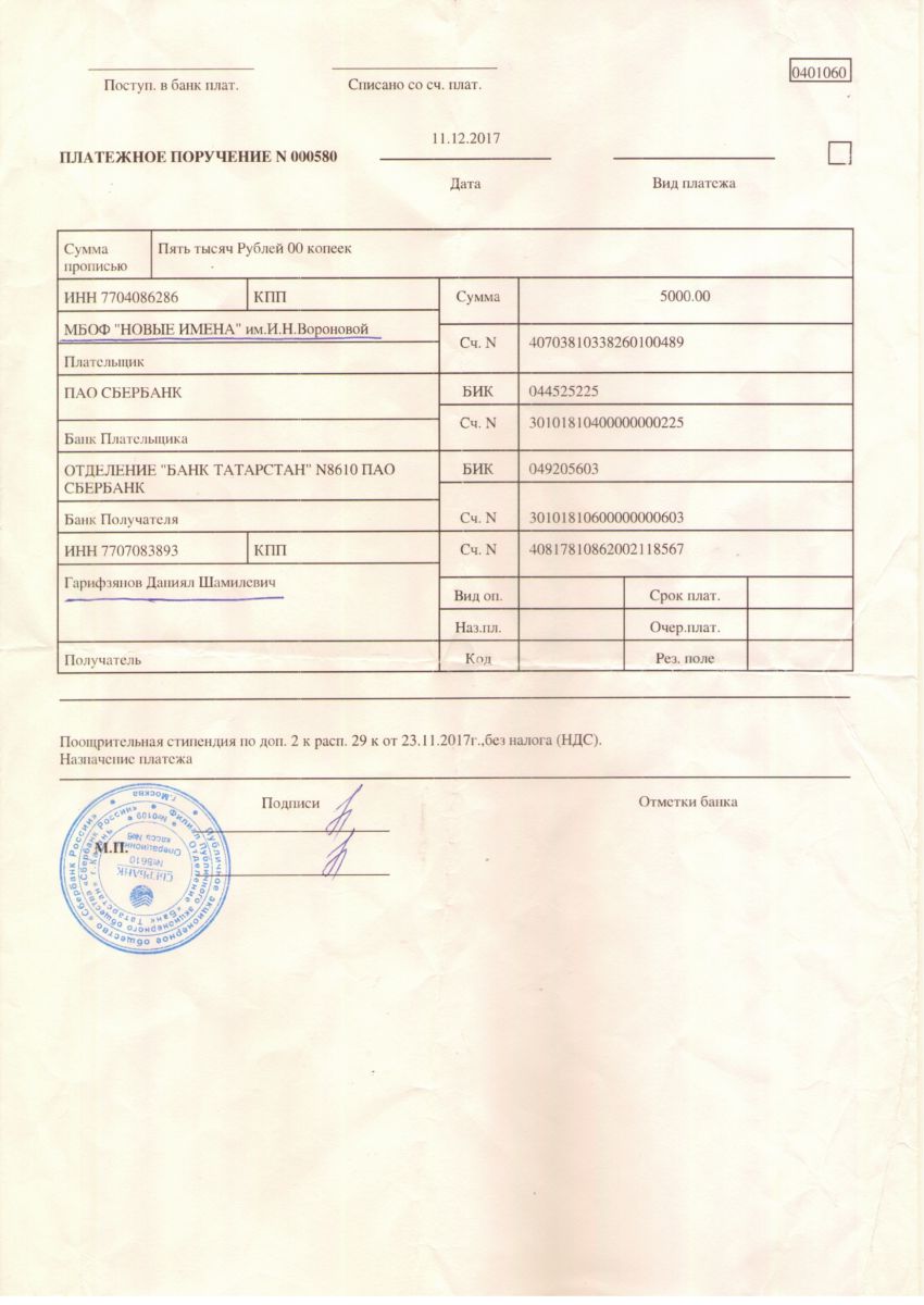 2017 год Гарифзянов Даниял обучающийся 6 класса (саксофон, класс преподавателя Хисамова А.А., концертмейстер Еникеева Э.Ф.) (сумма стипендии составила 5000 рублей)