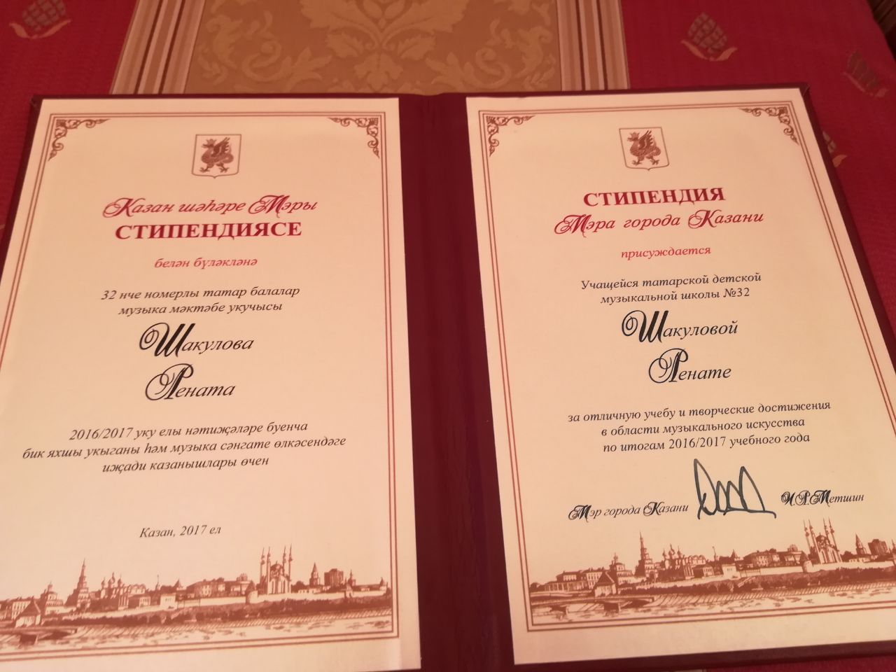 2017 год: Гарифзянов Даниял обучающийся 6 класса 10000 рублей (саксофон, класс преподавателя Хисамова А.А., концертмейстер Еникеева Э.Ф.) и Шакулова Рената обучающаяся 6 класса 10000 рублей (фортепиано, класс преподавателя Ирбулатовой Л.К.),