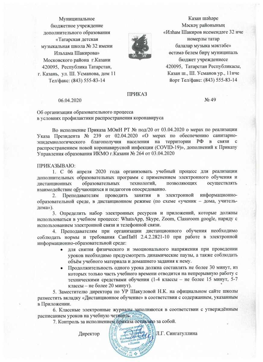 Приказ МБУДО "ТДМШ № 32 им. Ильхама Шакирова" № 49 от 06.04.2020