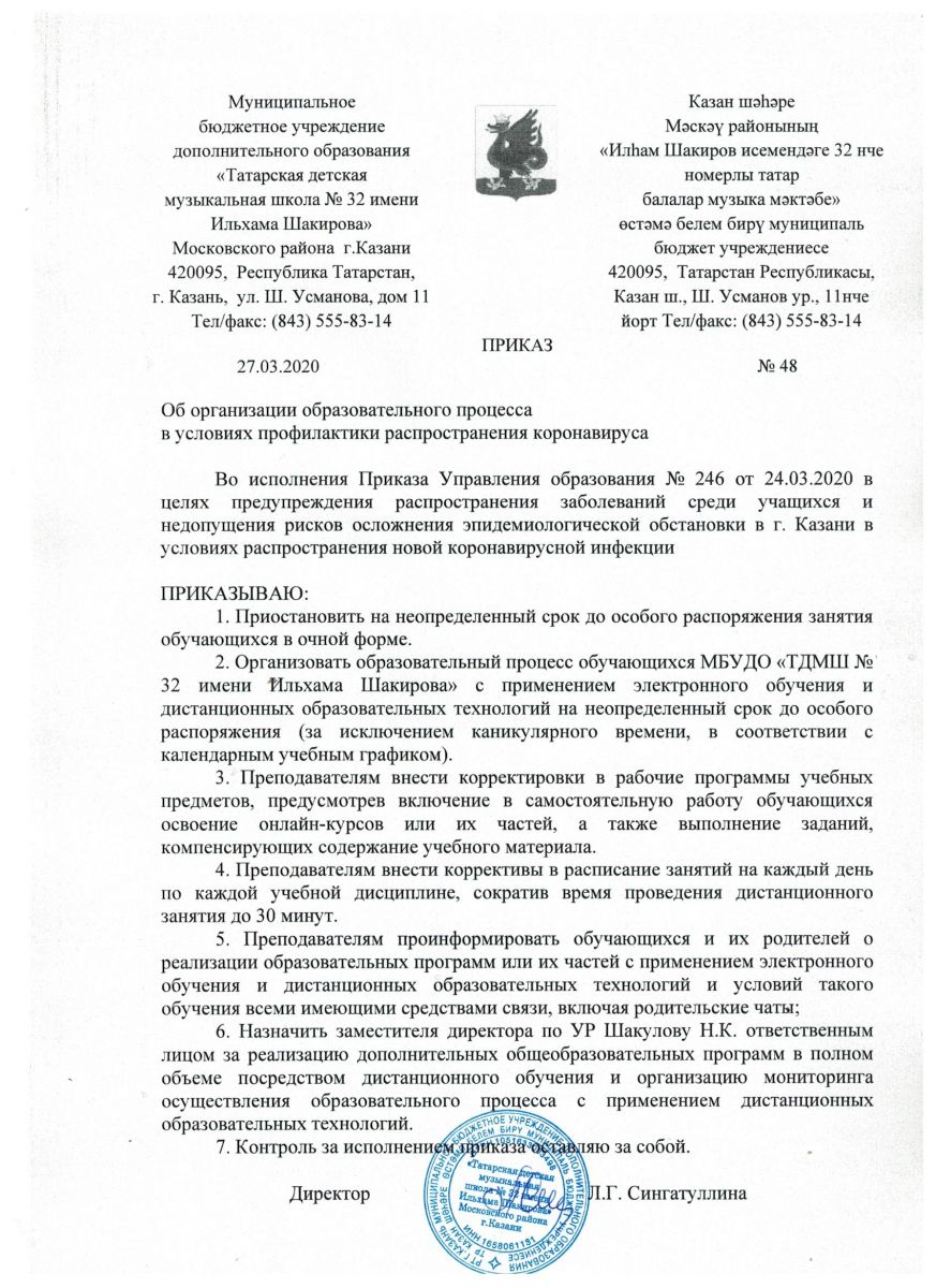 Приказ МБУДО "ТДМШ № 32 им. Ильхама Шакирова" № 48 от 27.03.2020