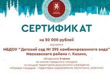 Много лет мы участвовали в кокурсе на лучшую территорию детского сада. Каждый год высаживали новые кустарники, цветы, вместе с родителями мастерили малые скульптурные формы, создали экологическую тропу. Наш садик стал похож на маленький санаторий. Вчера нам вручили Сертификат за второе место в городском конккурсе, а в районе мы первые!
