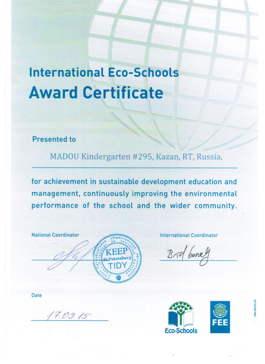 17.09.2015г. детскому саду вручили Зеленый флаг и международный сертификат к нему Санкт - Петербургской общественной организацией "Санкт - Петербург за экологию Балтики".