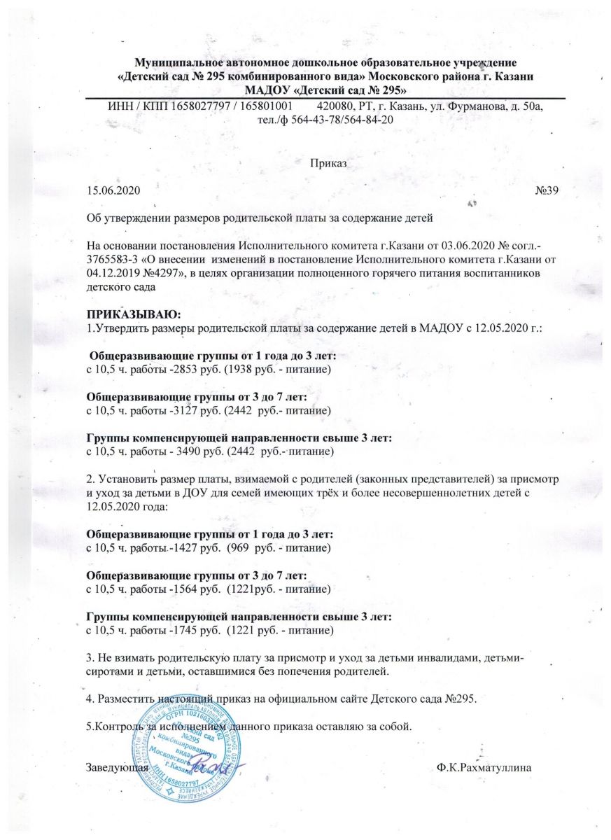 Приказ об изменении размера родительской платы за содержание ребенка в детском саду с 12.05.2020
