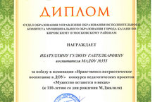 Диплом воспитателя Ибатуллиной Гулюзы Габтельбаровны, победителя номинации «Нравственно-патриотическое воспитание в ДОУ».