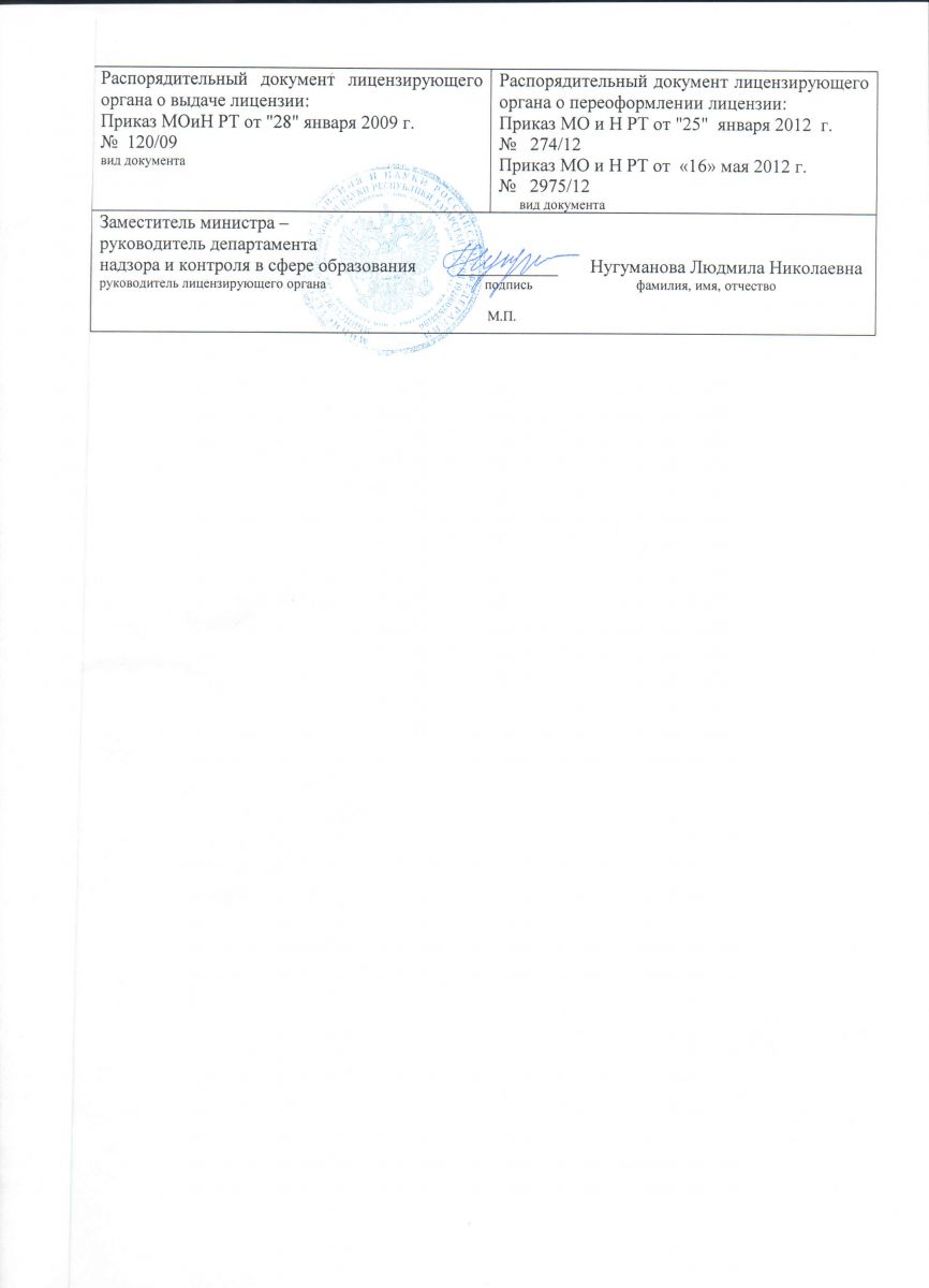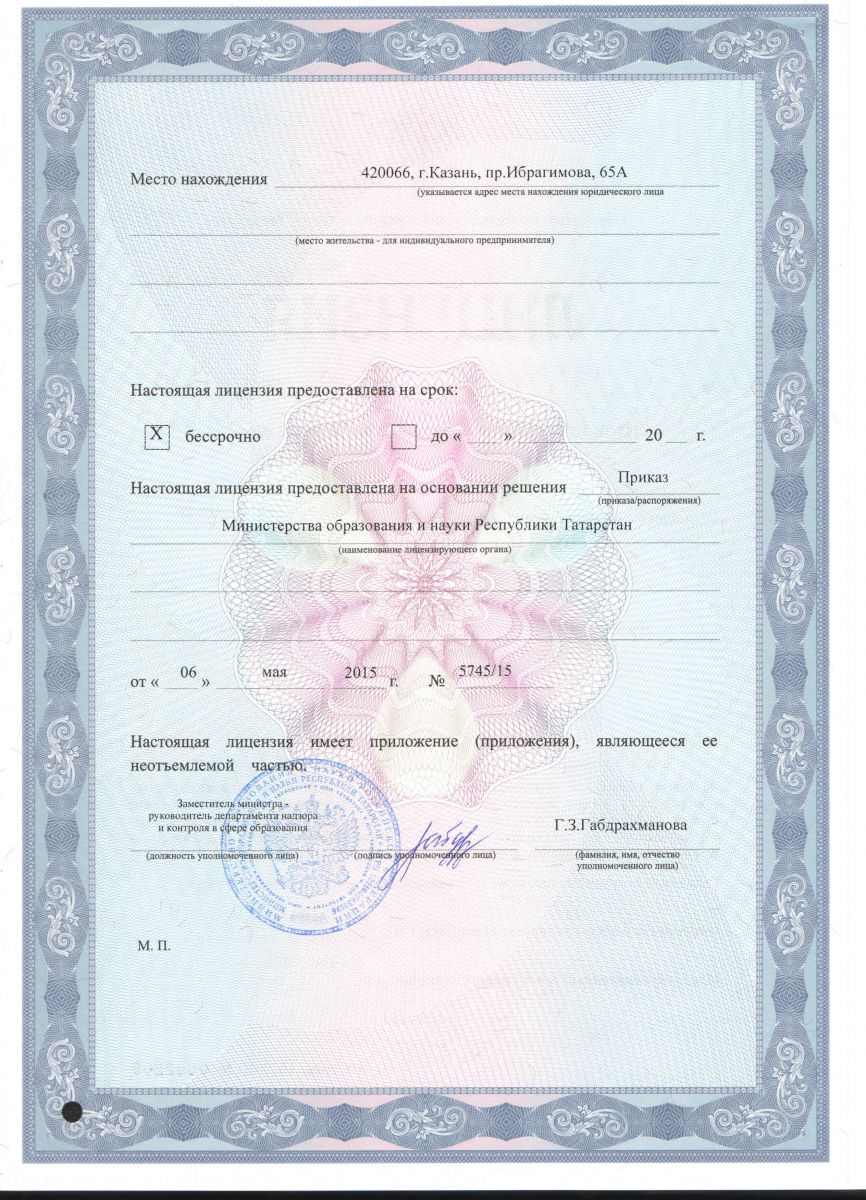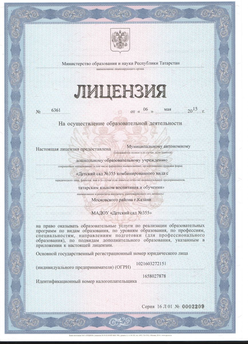 Лицензия на право ведения образовательной деятельности от 06.05.2015г. рег. № 6361 Серия 16 Л 01 № 0002209