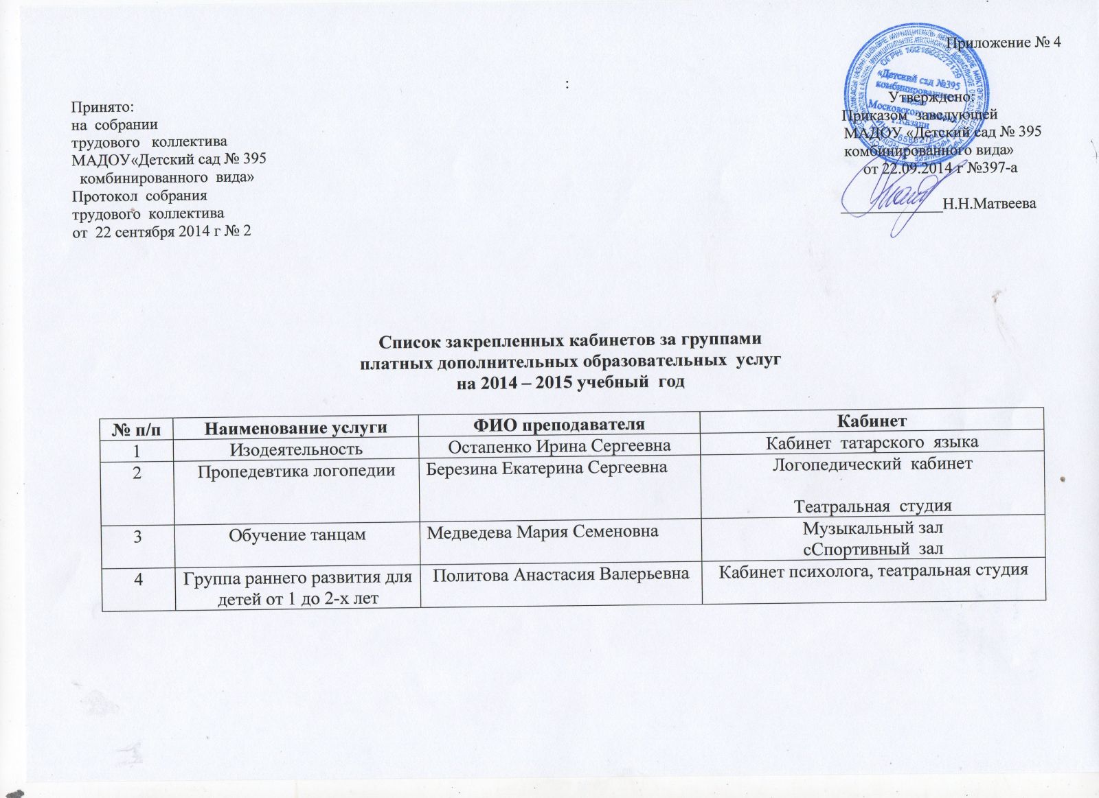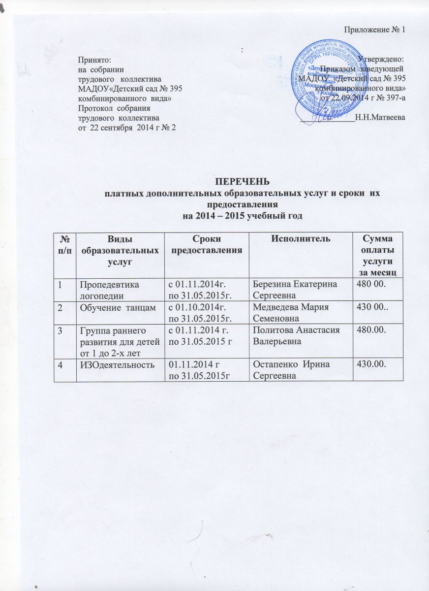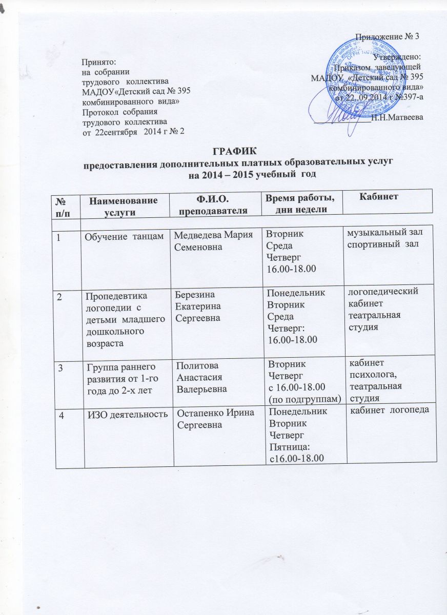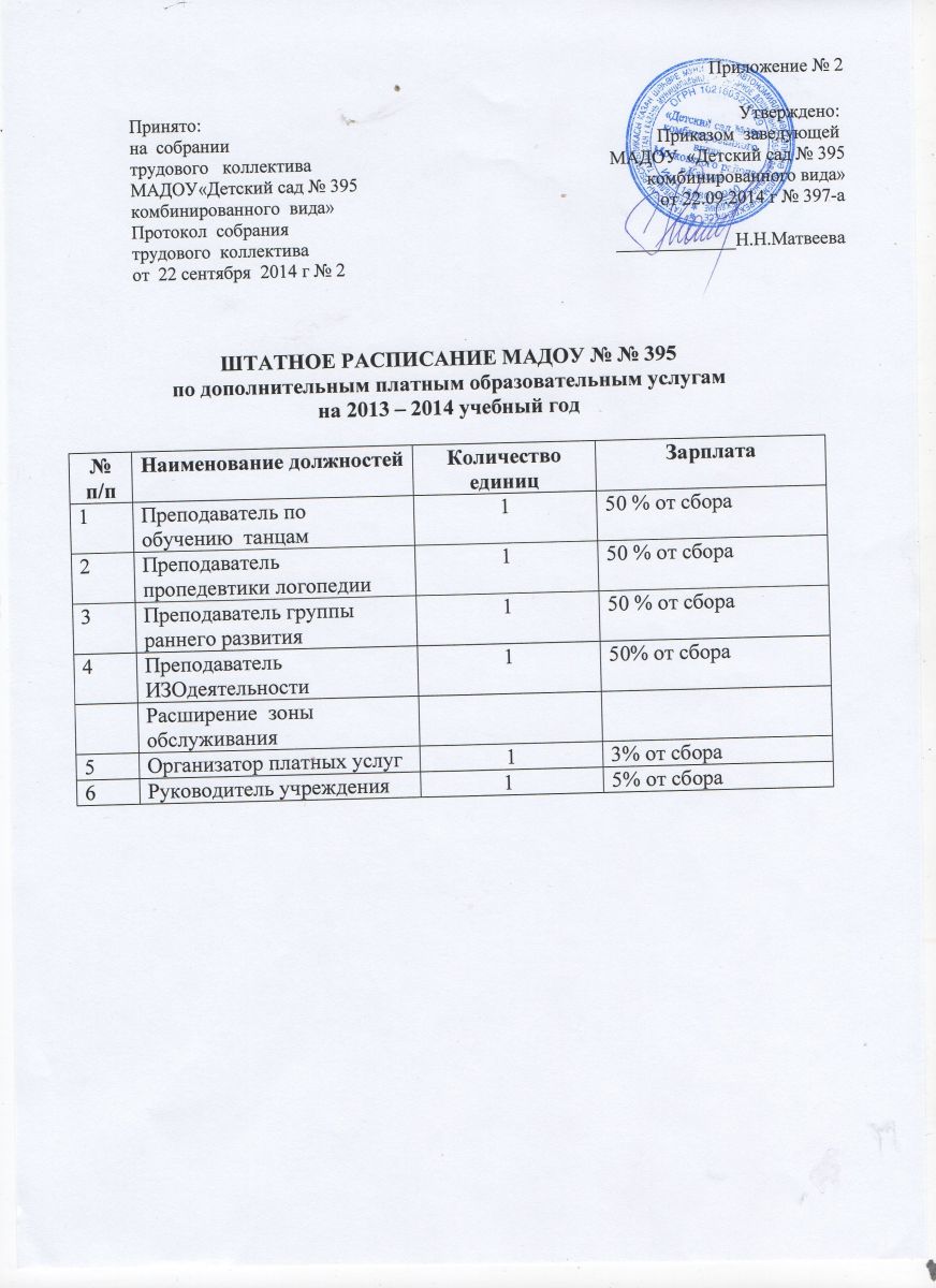 Штатное расписание МАДОУ № 395 по дополнительным платным образовательным услугам на 2014-2015 уч.год