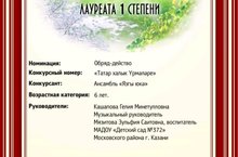 Безнең бакчада тәрбияләнүче Габитова Энҗе район күләмендә үткәрелгән "Татар кызычыгы -2020" бәйгесендә җиңеп, шәһәр күләмендә дә көч сынашты. Нәни йолдызыбызны җиңүе белән котлыйбыз. Бәйгегә әзерләүдә күп көч куйган педагогларга һәм эти-энисенә зур рәхмәтебезне белдерәбез. Котлыйбыз!