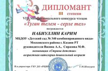 Воспитанник нашего Детского сада Набиуллин Карим , кураторы - воспитатели Васина Анастасия Алексеевна и Сиразова Миляуша Фагитовна, стал Дипломантом III степени на VIII Межрегиональном конкурсе чтецов « Туган телем – серле тел» , в номинации «Страна детства». Поздравляем победителя!