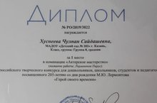Воспитанница нашего Детского сада средней группы №8 Хуснеева Чулпан заняла 1 место в российском творческом конкурсе, посвященном 205 летию со дня рождения М.Ю.лермонтова "Герой своего времени" в номинации - актерское мастерство. Поздравляем Чулпан с победой, и желаем дальнейших творческих побед.