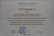 Наш детский сад принимал участие в IV Городском конкурсе инновационных программ, проектов и методических разработок в номинации "Дошкольное воспитание". Поздравляем всех нас с получением Сертификата за педагогический проект "Здоровый ребенок: Физкультура и спорт". Огромное спасибо за активное участие нашим педагогам, родителям и конечно же ребятам!!!