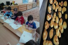 После завтрака закипела работа. Ребята вместе с воспитателем, под руководством поваров замесили тесто, раскатывали его. Все ребята были увлечены процессом, каждый попробовал сам взбить яйца, под дружный хохот детишки сами добавляли муку, отмеряли в нужной пропорции сахар, ванилин и сливочное масло.
