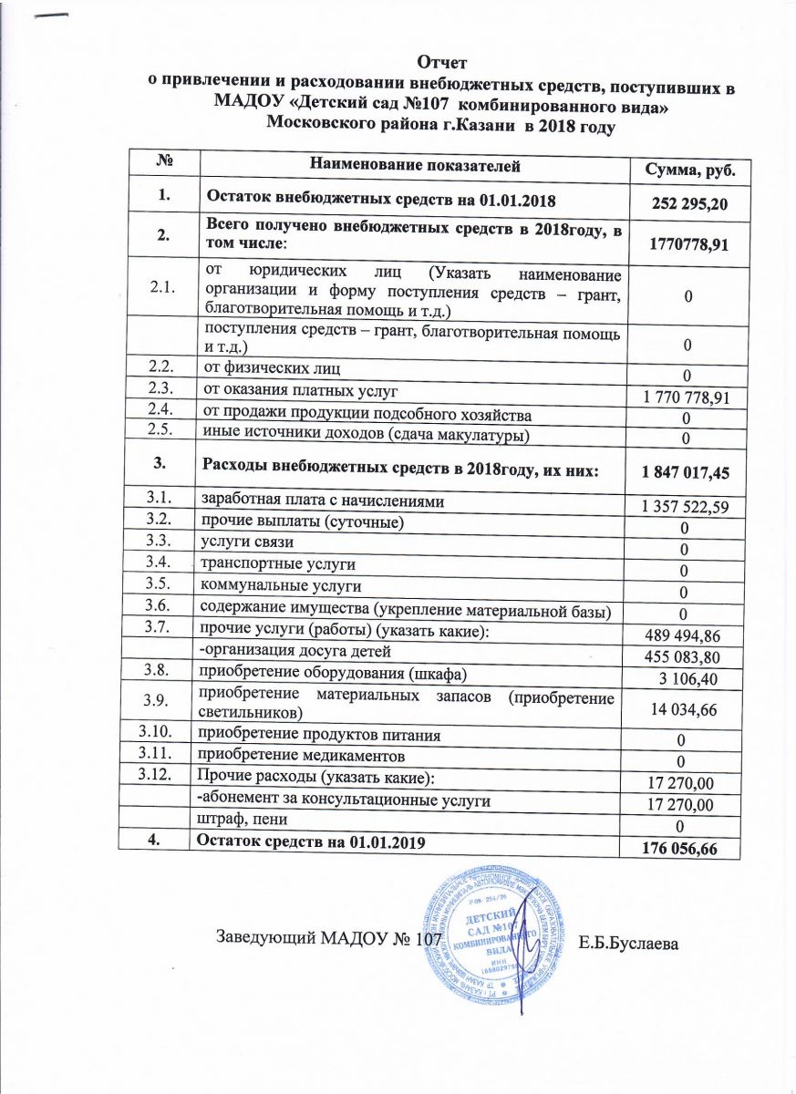 Отчет о привлечении и расходовании внебюджетных средств в 2018 году МАДОУ № 107