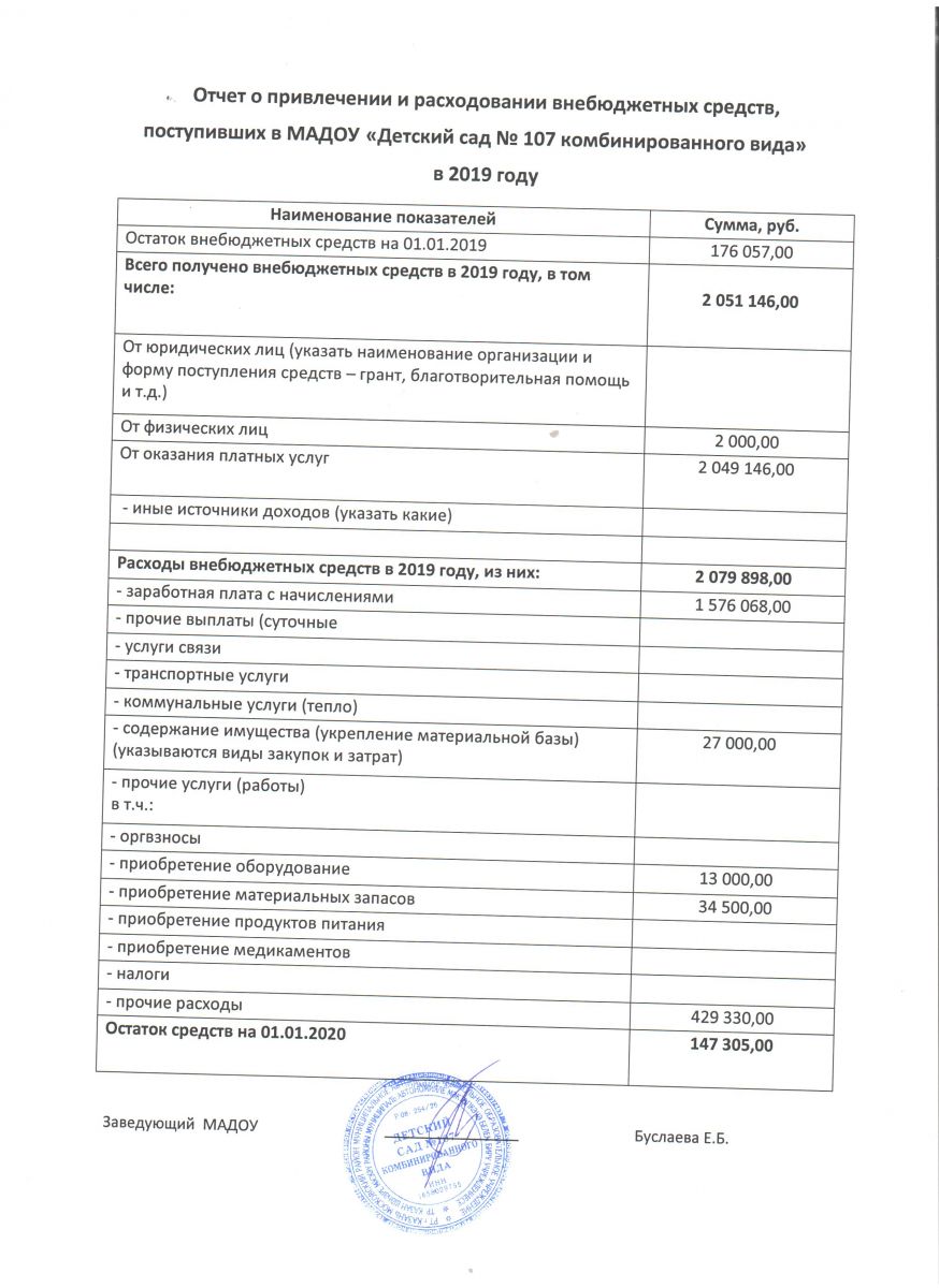 Отчет о привлечении и расходовании внебюджетных средств в 2019 году МАДОУ №107