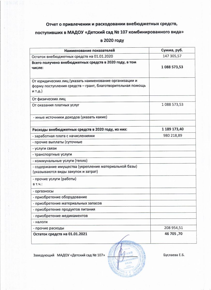 Отчет о привлечении и расходовании внебюджетных средств в 2020 году МАДОУ 107