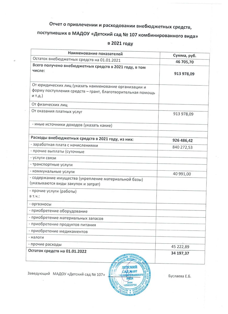 Отчет о привлечение и расходовании внебюжетных средств в 2021 году МАДОУ №107