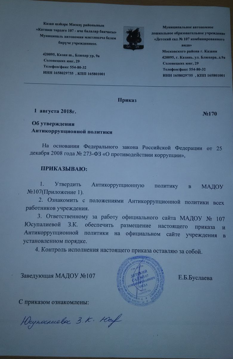 - Приказ об утверждении Антикоррупционной политики и приложение к нему: /upload/storage/org2913/files/P_20180801_114728[1].jpg ; /upload/storage/org2913/files/приложение к прик №170 (1).docx